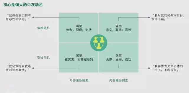 為了抵制這種傾向,組織意識到不能僅依靠外部激勵因素來激發人們的思維和內心情感,還需要內在激勵因素。外部激勵因素側重于個人獲得獎賞的愿望(而不是被懲罰),以及得到領導和同行的認同。內在激勵因素包括員工對工作中的意義、聯系和喜悅的渴望,以及對貢獻、發展和成功的渴望(參閱下圖)。初心是最強大的內在激勵因素之一,因為它與思維(指導和調整行為的指南針)和內心情感相呼應。