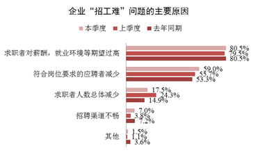 從招工難的原因看,一是求職者對薪酬、就業環境期望過高,占80.5%,環比增加了1.0個百分點。二是符合崗位要求的應聘者減少,即人崗不適應的,占59.0%,三是求職者人數總體減少,占17.5%。從三個季度的監測情況看,人崗不適應的情況略有增多。(此項為多選,各項占比相加不等于100%)